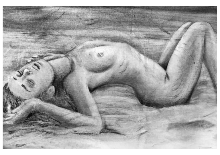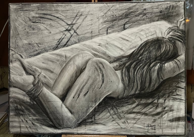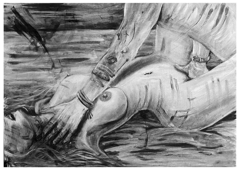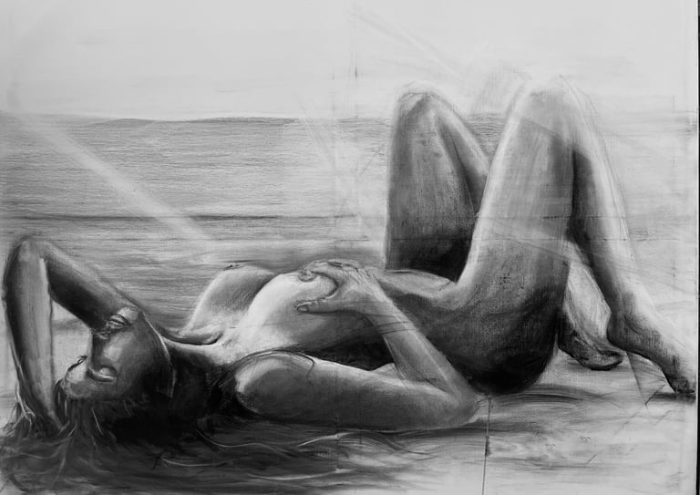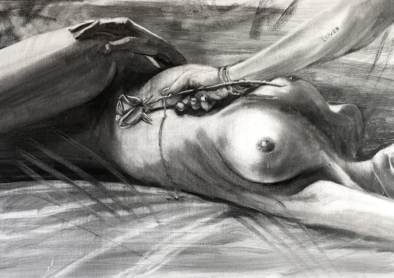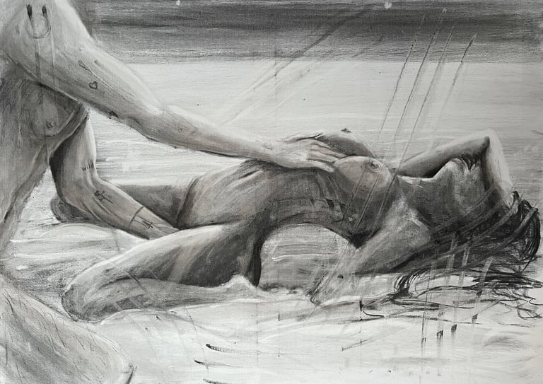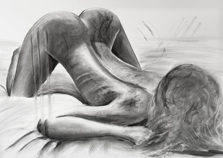A series of charcoal artworks portraying the messy, fervent passion in a lustful evening, filled with vibrant emotions and raw energy that captures the fleeting moments of desire and creativity intertwined. Finished with wet fingers scratching across the canvas.