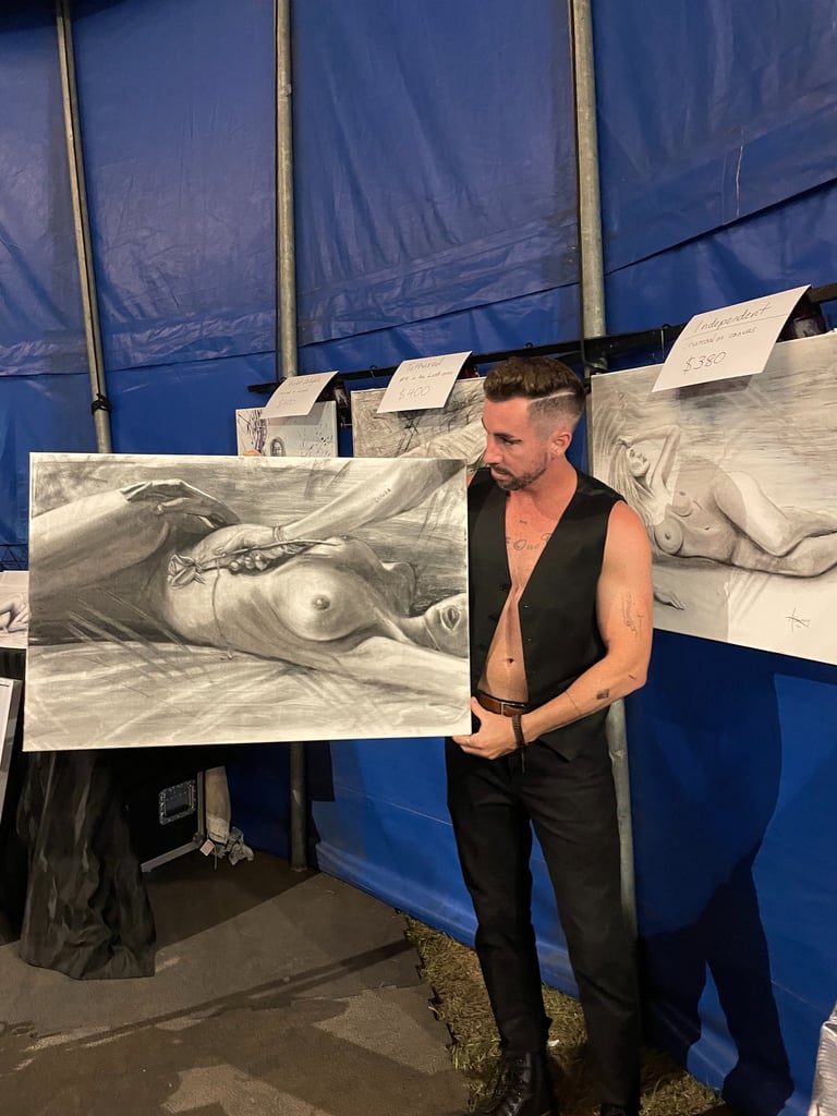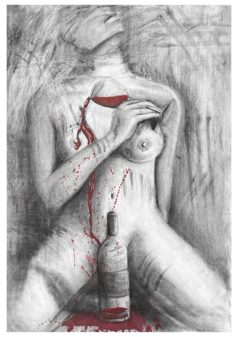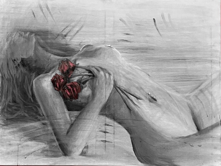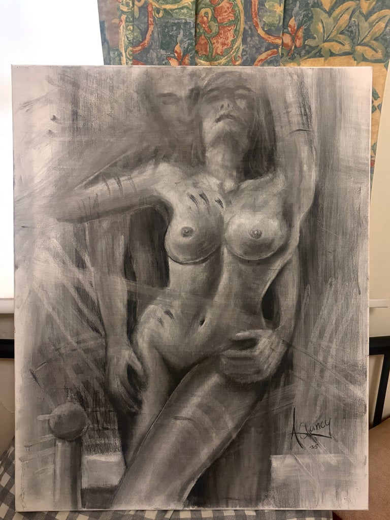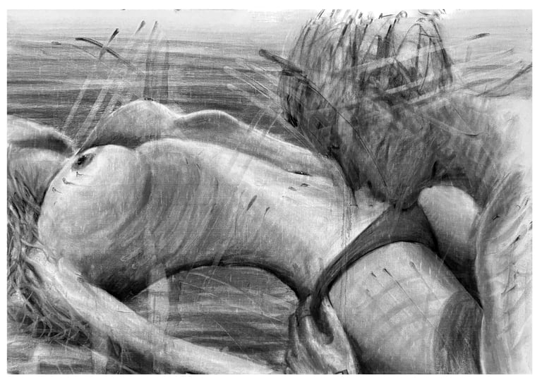 A series of charcoal artworks portraying the messy, fervent passion in a lustful evening, filled with vibrant emotions and raw energy that captures the fleeting moments of desire and creativity intertwined. Finished with wet fingers scratching across the canvas.